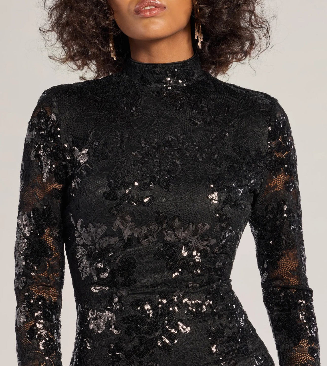 El minivestido de encaje con lentejuelas presenta un cuello alto, mangas largas ajustadas y transparentes, un atrevido diseño de espalda abierta con un detalle de tiras en la parte baja de la espalda y un estampado de hojas con lentejuelas. Completa tu look formal con tacones brillantes.