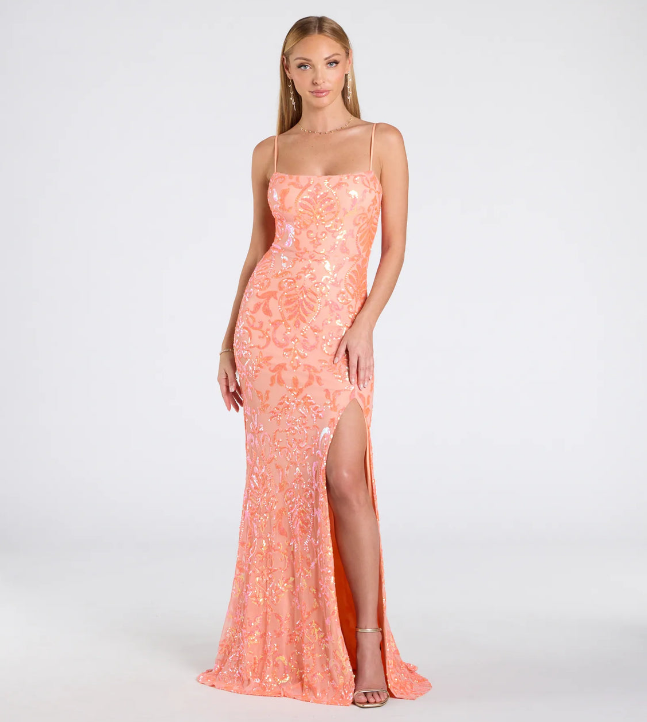 ¡Luce radiante con el vestido formal de lentejuelas Celina y deslumbra bajo las luces de la pista! Este vestido formal luce una llamativa espalda con cordones, una abertura frontal alta para mayor movimiento y una silueta sirena que realza tus curvas.