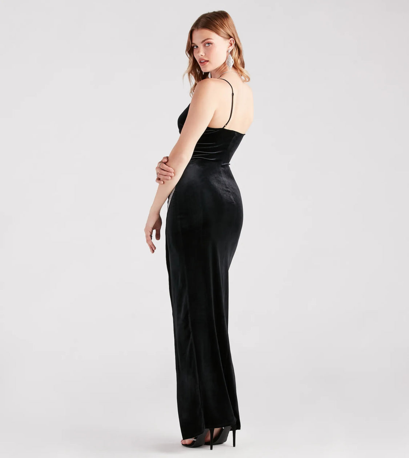 Con glamorosos detalles de pedrería, el vestido formal de terciopelo Dina brilla con luz propia en bailes escolares y veladas elegantes. Presenta un escote en V cruzado sin mangas, tirantes finos ajustables, costura plisada lateral, silueta estilizada y una abertura asimétrica adornada con pedrería que termina en un dobladillo largo hasta el suelo. Este vestido formal está confeccionado en un suave terciopelo que le dará un toque lujoso a tu noche. Completa el look con pendientes de flecos y un clutch.
